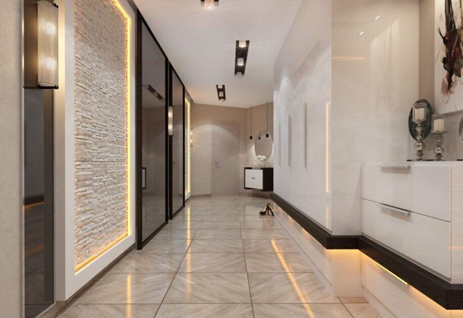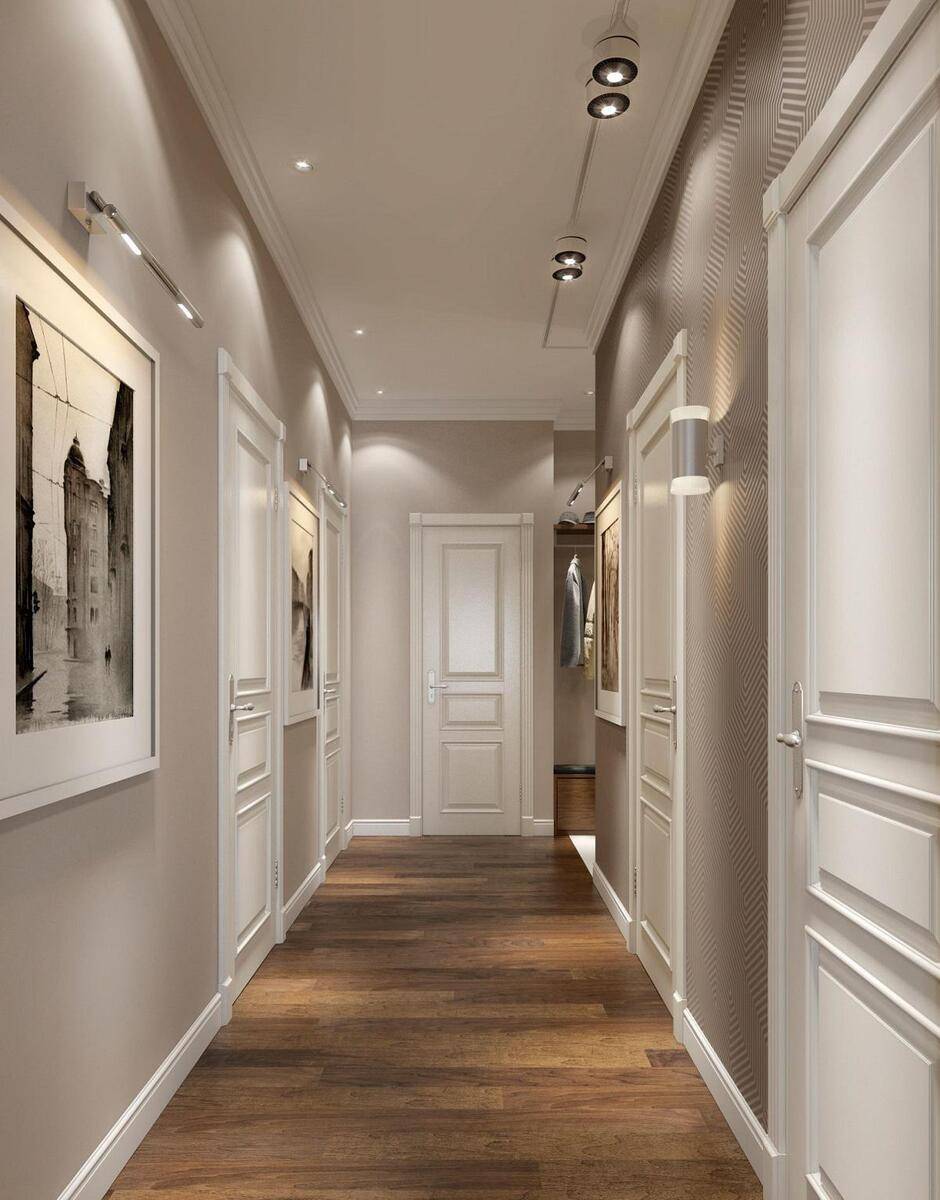 Чтобы визуально расширить площадь следует подбирать светлую отделку для стен. А с низкими потолками помогут справиться глянцевые потолки. Света должно быть много, так как в коридорах обычно темно. Точечные светильники устанавливаются по периметру, а светодиодные ленты помогут подчеркнуть зеркала или коллекцию фотографий.