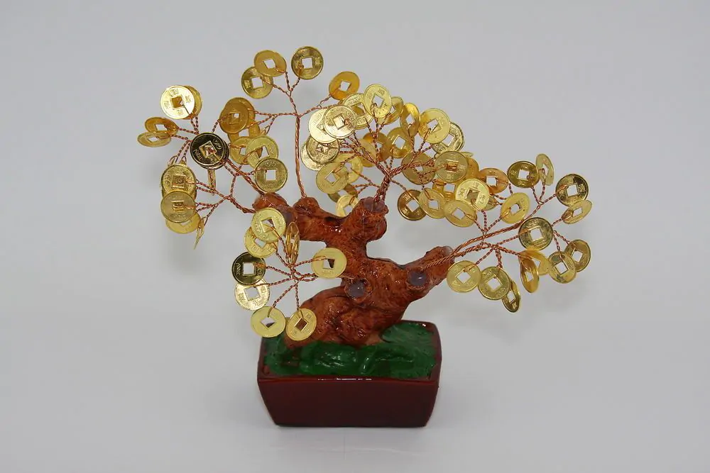 Затем можете смело приступать к украшению деревца китайскими монетками – это монеты, в центре которых есть квадратное отверстие. Если вы не имеете возможность приобрести именно такие – берите любые, обязательно предварительно просверлив в середине дырочку. Крепите их к ветвям и не скупитесь – чем больше монет будет подвешено, тем скорее ваша жизнь придет в гармонию и начнет улучшаться.