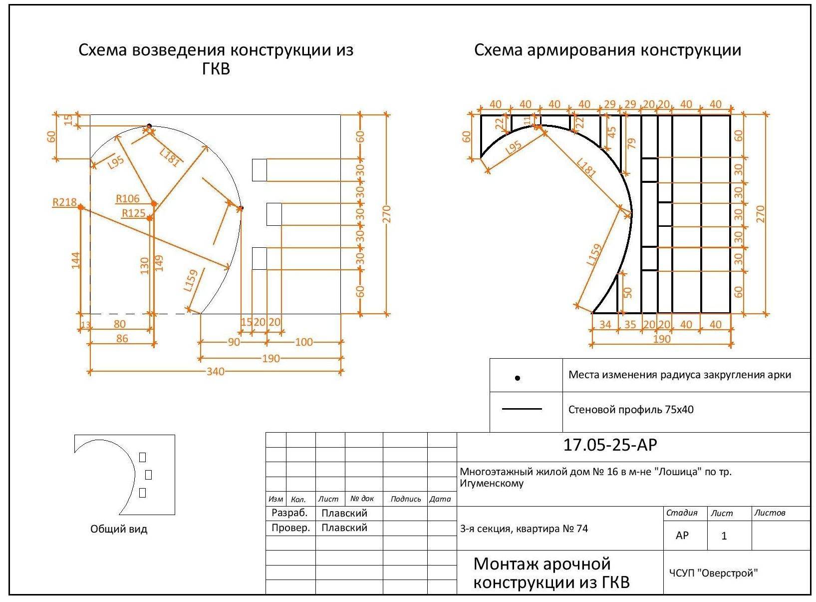 Сделать дверную арку своими руками можно с не меньшим успехом в заново возводимой перегородке из ГКЛ. Чертеж такой конструкции представлен ниже.