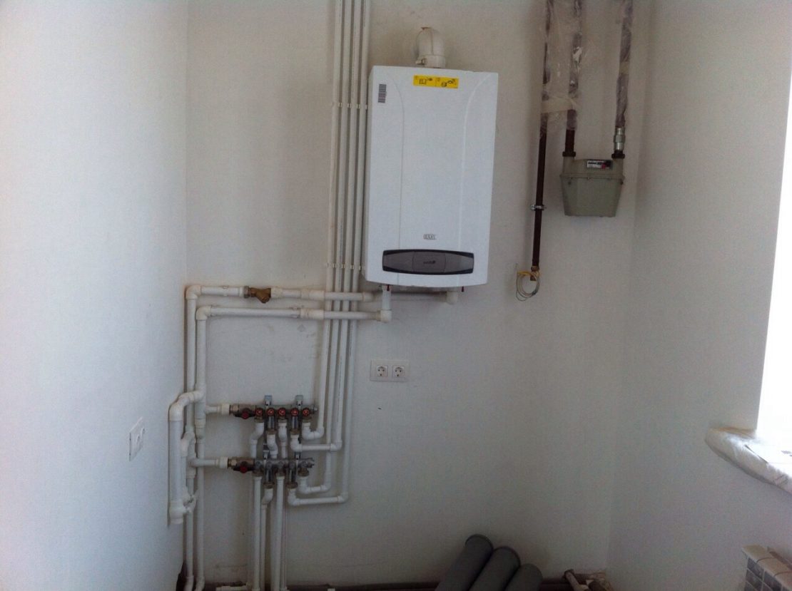 Основным элементом теплоснабжения квартиры является настенный двухконтурный газовый котел, оснащенный закрытой камерой сгорания. Котлы данного типа не нуждаются в специальном монтаже газохода. Функциональный вентилятор позволяет осуществлять подачу и забор воздуха с улицы, а затем вывод продуктов сгорания посредством специальных труб.