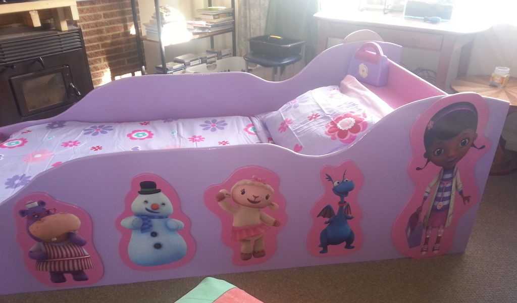 На основе той же конструкции сделана кровать для девочки. По форме перила проще, работы с ними меньше, но сложнее с покраской. Так что тоже свои моменты.