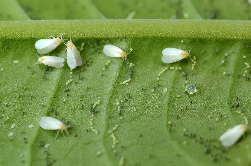Белокрылка очень быстро размножается и растёт. Личинки могут вырасти всего за 20 дней, поэтому борьбу нужно начинать вовремя, ведь вывести огромную колонию вредителей гораздо сложнее. Фото: cvetok-v-dome.ru