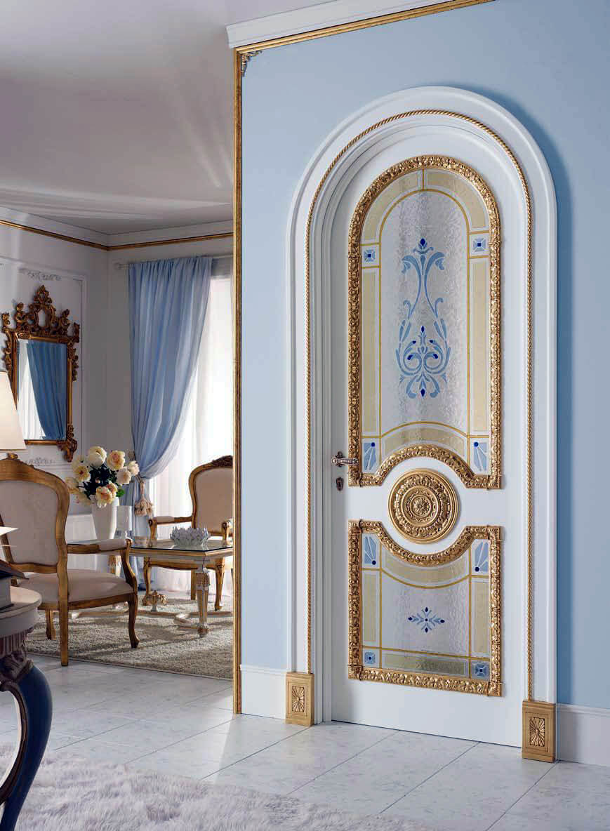 - глухая массивная дверь с резьбой подойдет для классического интерьера помещения. Уместными здесь же окажутся витражные и зеркальные вставки;