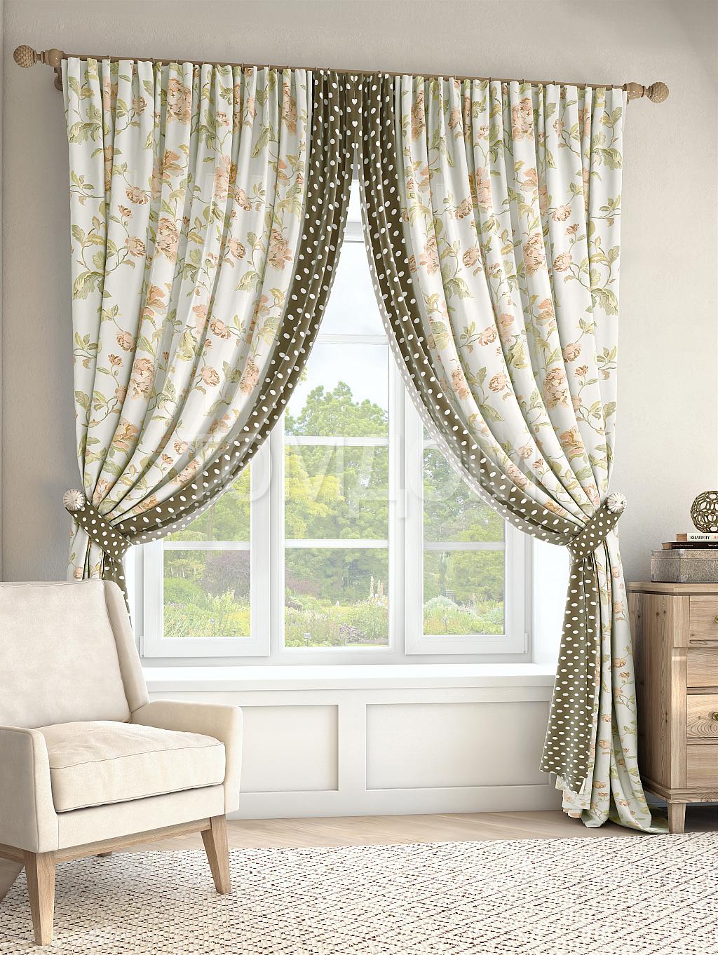 Очень привлекательно они смотрятся в сочетании с цветочными и фруктовыми орнаментами. Как эффектно выглядят бежевые шторы в интерьере гостиной, на фото можно хорошо рассмотреть. Что касается материалов для этих изделий, стилисты советуют выбирать для стиля кантри простые натуральные ткани – хлопок, ситец и лен.