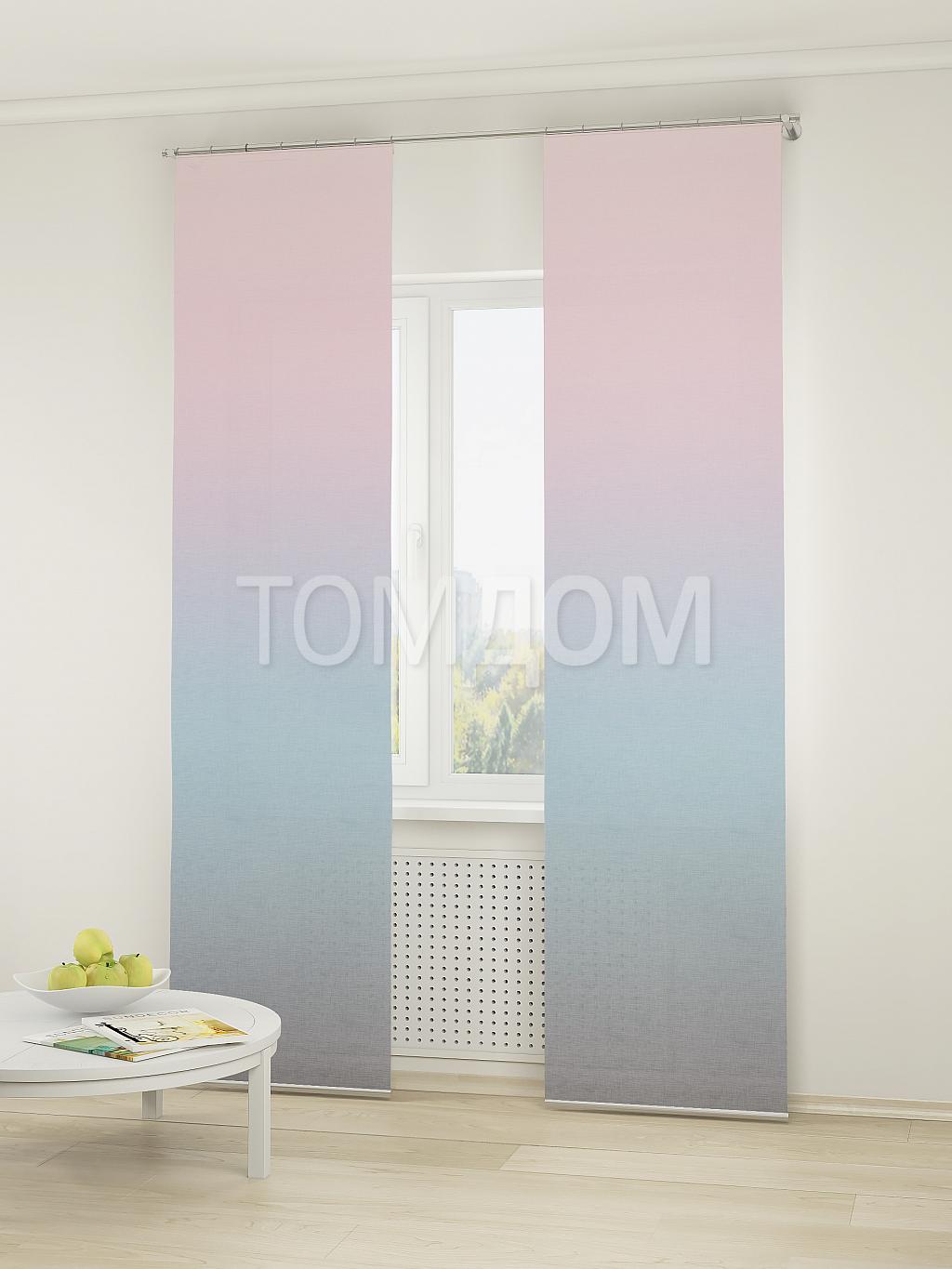расширяют пространство также мягкие вертикальные складки, градиентные переходы цветов с затемнением внизу, аккуратный асимметричный color blocking и фактурные горизонтальные полоски-бордюры по нижней линии шторы;