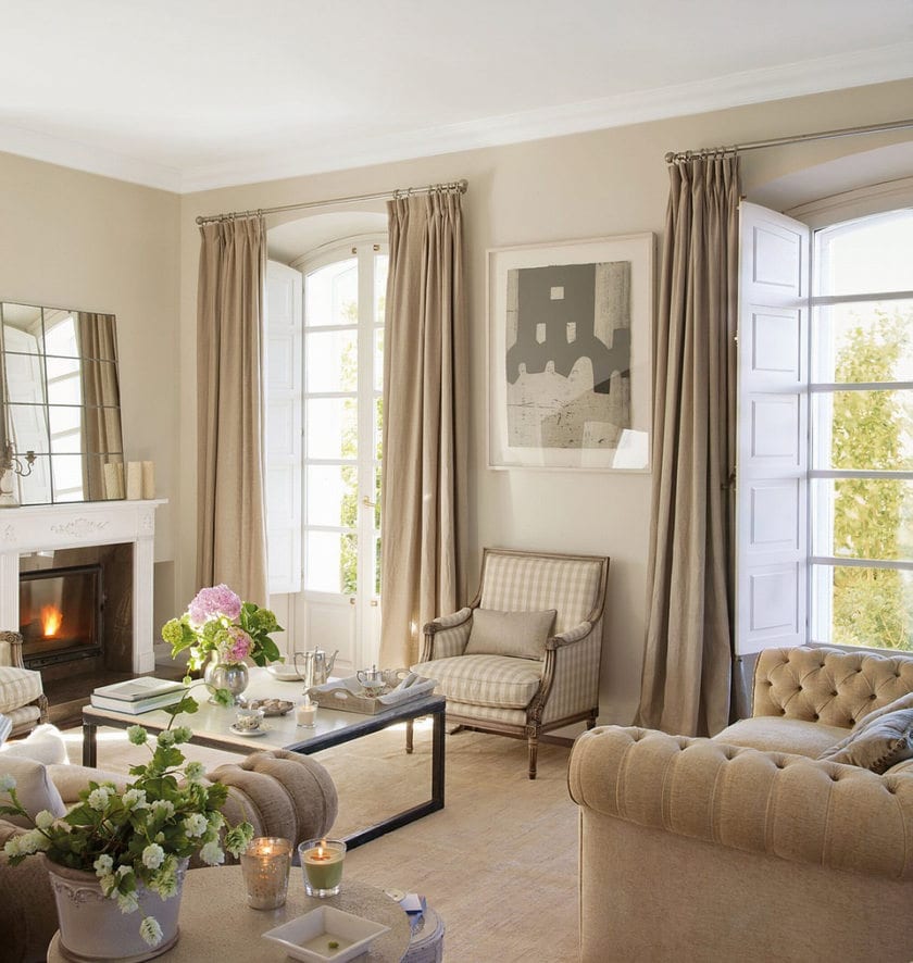 Как правило, шторы в бежевых тонах выбирают для гостиных в той же палитре. Стены могут быть светлее или темнее – все зависит от стиля, особенностей помещения, личных предпочтений и других нюансов. Среди вопросов, которые необходимо решить, — оттенок, плотность, формат гардин.