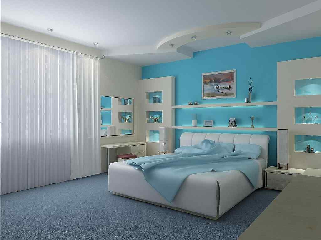- Если стены будут бирюзовыми, комнату можно обставить темно-синей мебелью или повесить ярко-синие шторы.