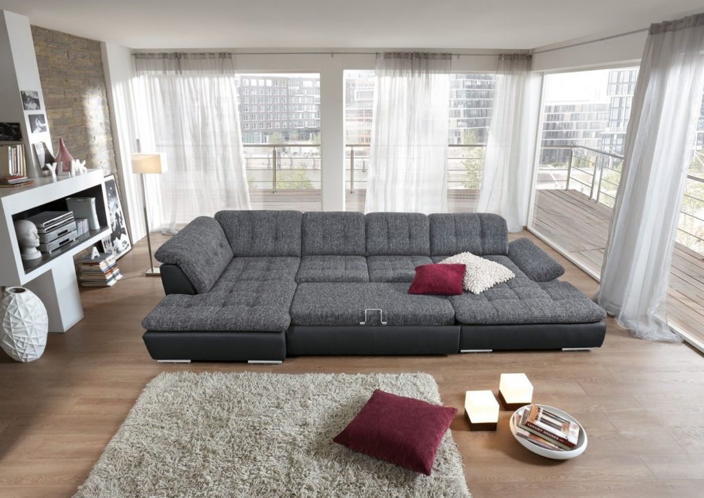 Большие диваны для гостиной, как и их более компактные собратья, могут оснащаться раскладным механизмом. Обычно он предусмотрен для угловых моделей