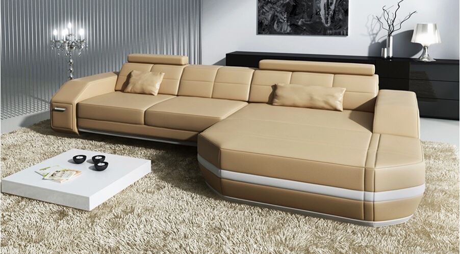 Если пространство оформлено в темные тона, то отличным решением будет кожаный диван светло-бежевого оттенка.
