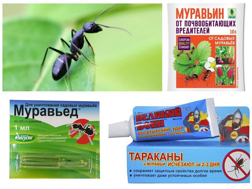Самыми действенными средствами защиты садового участка от вредителей, в том числе от муравьев и тли, являются химические средства. Их использование способствует уничтожению поселившейся семьи насекомых. Однако эти средства не помогут избавиться от муравьев навсегда. Применение химических препаратов должно проходить в строгом соответствии с прилагаемой к ним инструкцией, чтобы избежать негативного воздействия средств. Самыми популярными препаратами от муравьев являются: Гром-2, Мурацид, Муравьед, Delicia.