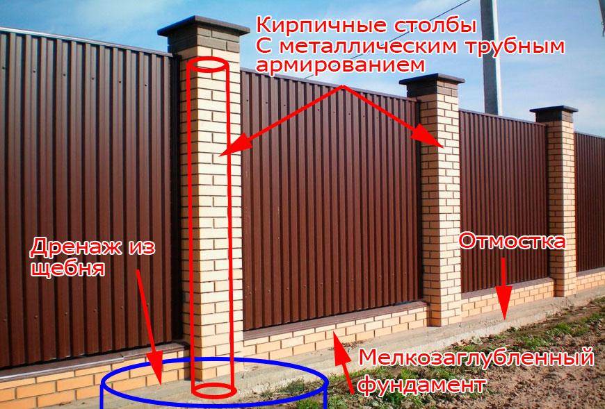 Забор из профнастила на кирпичных столбах с металлическим трубным армированием