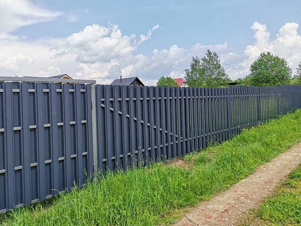 Один из наиболее распространенных вариантов ограждений, надежно защищающий участок от посторонних глаз, бродячих животных и других неприятностей. Для установки потребуется крепкий бетонный фундамент, листы металлопрофиля фиксируются на опорных столбах и лагах при помощи саморезов.