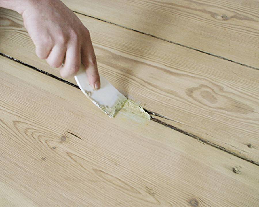 Затем шпаклюют все стыки и изъяны по полу. Для этих целей подойдет заводская шпаклевка либо же пыль, оставшаяся после шлифовки с клеем ПВА. Она придаст нужный оттенок.