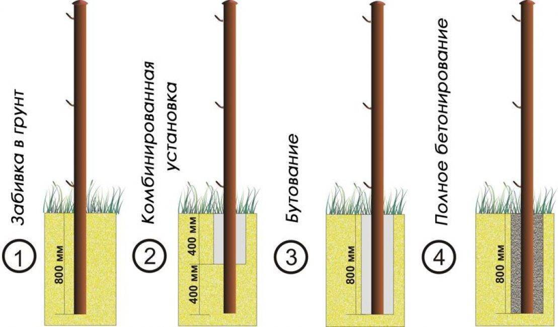 Под столбы выкапываются ямки глубиной от 80 см до 1 м. Для установки таких ограждений столбы можно не бетонировать. На дно ямы слоем примерно 10-15 см насыпается песок, щебень и гравий, затем устанавливается столб. Чтобы полностью закрыть яму, до верха засыпается щебень и битый кирпич, затем все следует хорошо утрамбовать. Сверху все нужно залить раствором, приготовленным из 1 части цемента, 4 частей песка и такого же количества воды и щебня.