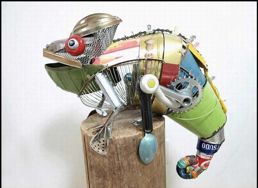 Еще одно интересное животное, но здесь уже прослеживается, кто это – хамелеон. А сделан он также из бытового мусора. Если присмотреться, то можно увидеть массу ненужных мелочей и всякой всячины.