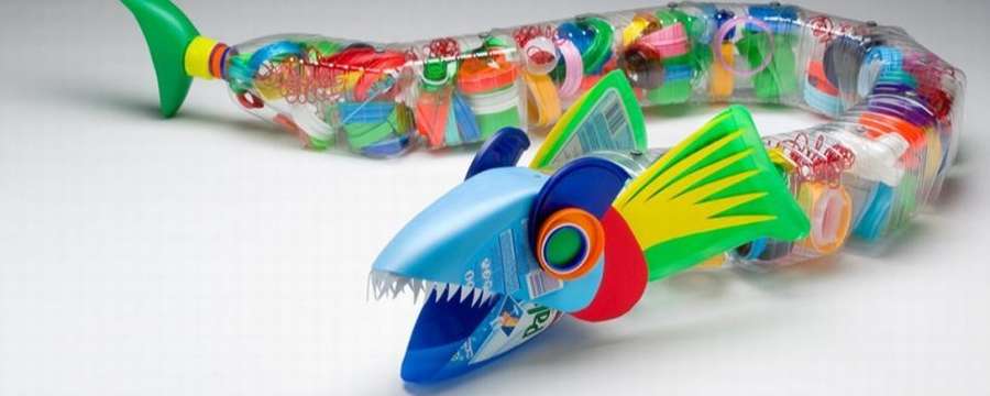 Интересная то ли рыба, то ли змея, то ли – гибрид того и другого. А для изготовления использованы самые обычные пластиковые остатки от бутылок и прочей мелочи.