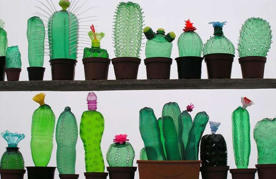 Ну а любителям необычного декора точно понравятся кактусы разного вида, выполненные из пластиковых бутылок. За ними не надо ухаживать и вести они могут постоянно.