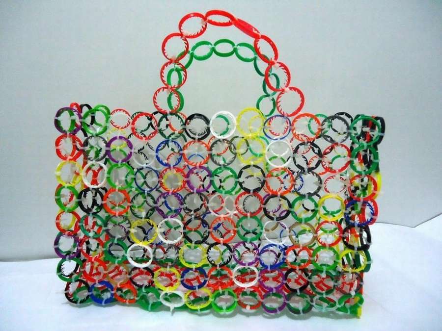 А из деталей крышки на пластиковые бутылки можно сделать интересную сумку. Такой пляжный вариант, внутри которого может лежать полотенце и что-то еще подобное.