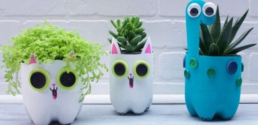 А вот здесь уже не просто предмет декора, а вполне нужная для любителей домашних цветов – вещь – цветочные горшки. Выполняем из пластиковых бутылок и дополняем декором в виде глазок, носика, ушек – милые котики и динозаврик.