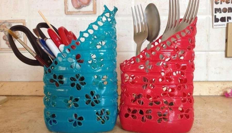 Ненужные пластиковые бутылки могут принять вот такой вид подставок для канцелярии или столовых приборов.