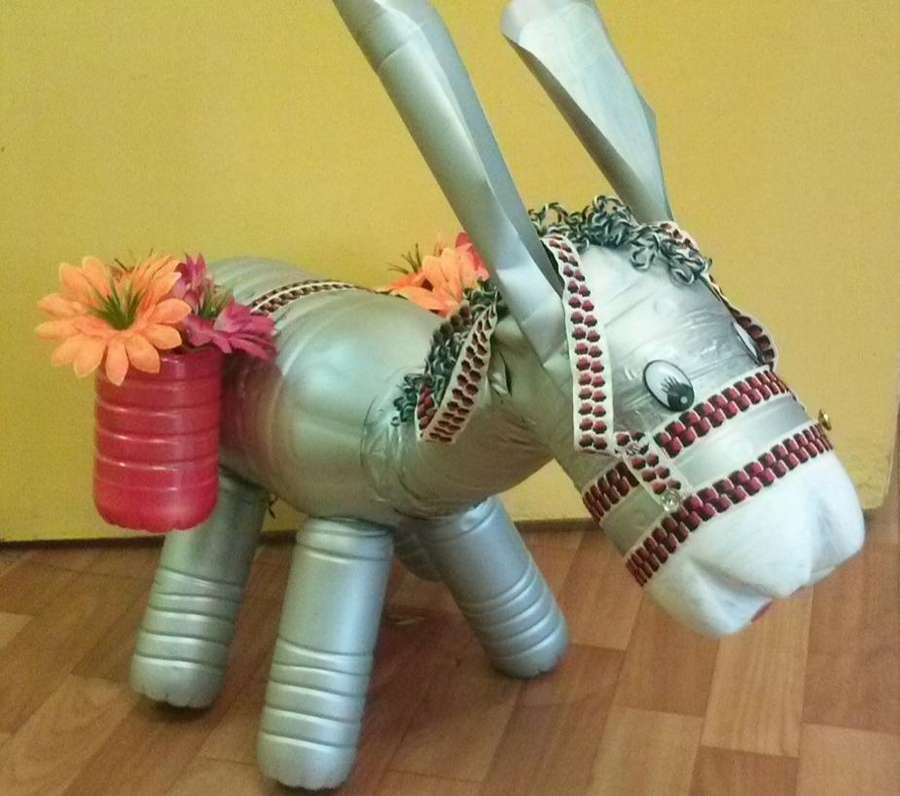 Можно считать это как предметом декора, так и отличный вариант подставки для пары цветочных горшочков. Окрашенные бутылки из пластика могут превратиться в очаровательного ослика с поклажей в виде этих самых цветочных горшков.