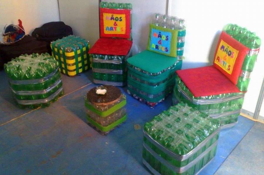Отличные стулья можно сделать из пластиковых бутылок, если скрепить из изолентой, и положить подушки для мягкости на сиденье и на спинку.