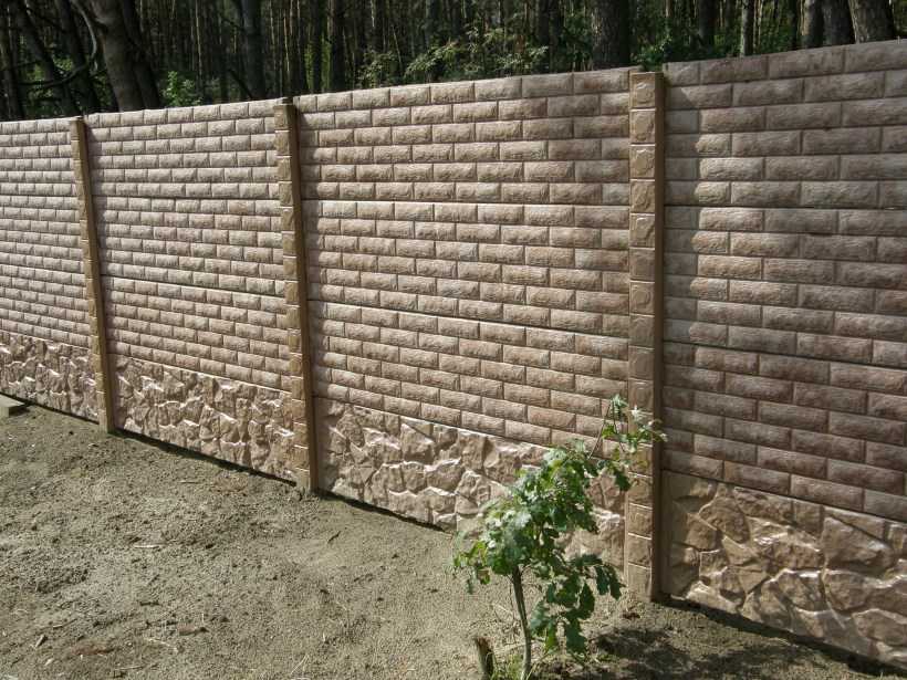 Такие ограждения производятся из тяжелых бетонов и стальной арматуры. Это делает ограду устойчивой к температурным перепадам, растяжению и сжимающим нагрузкам. Под такое сооружение не требуется сплошной фундамент, как под кирпичные заборы. Кроме того бетонные плиты: