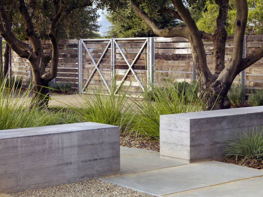Красивую и надежную изгородь можно сделать из бетона. Этот материал довольно пластичный, он легко принимает требуемую форму, подчеркивая дизайн сада и помогая правильно зонировать пространство придомовой территории. Для лаконичного дизайна используются простые и строгие линейные формы, поверхность бетона не декорируется. Для классического сада бетону можно придать внешний вид кирпича, каменной плитки или имитировать плетение ветвей.