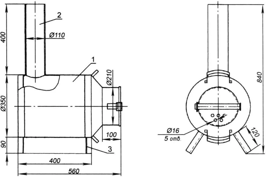Сначала о том, как сделать вертикальную печь для гаража из баллона или трубы. Выбранный отрезок делите на две неравные части. Внизу меньшая — для сбора золы, выше — основная для закладки дров. Далее порядок работ такой:
