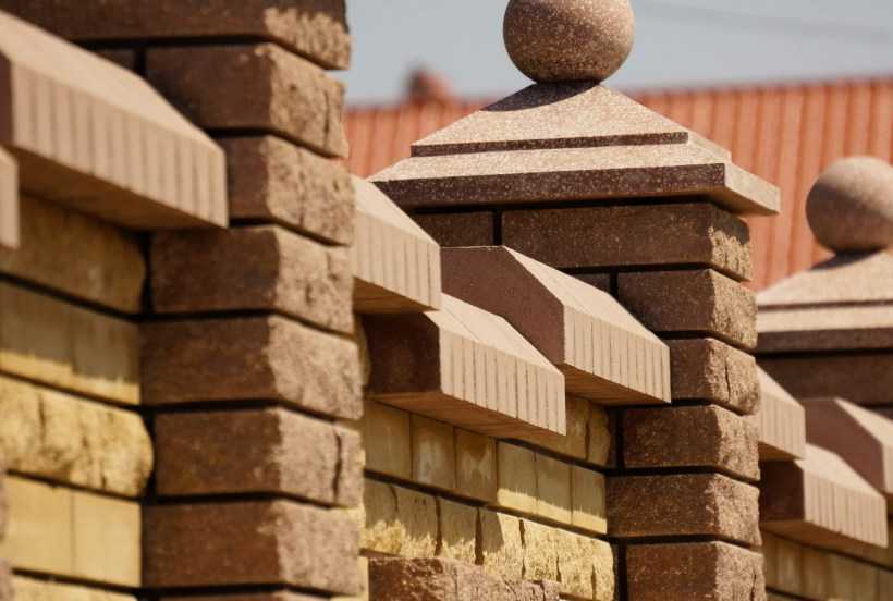 Для долговечности забора верхние ряды скрывают под декоративными навесами из пластика, осадки и влага не задерживаются на текстуре кирпича, и не приносит вреда конструкции.