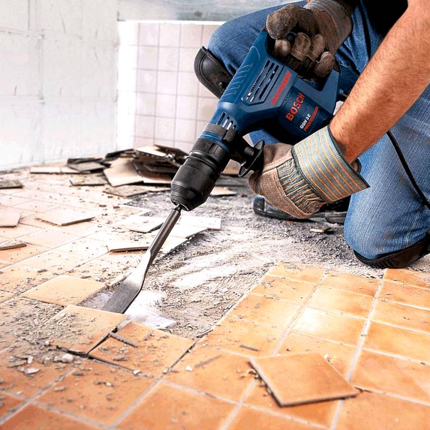 Для демонтажа старой плитки с пола следует воспользоваться перфоратором с насадкой в виде лопатки-зубила