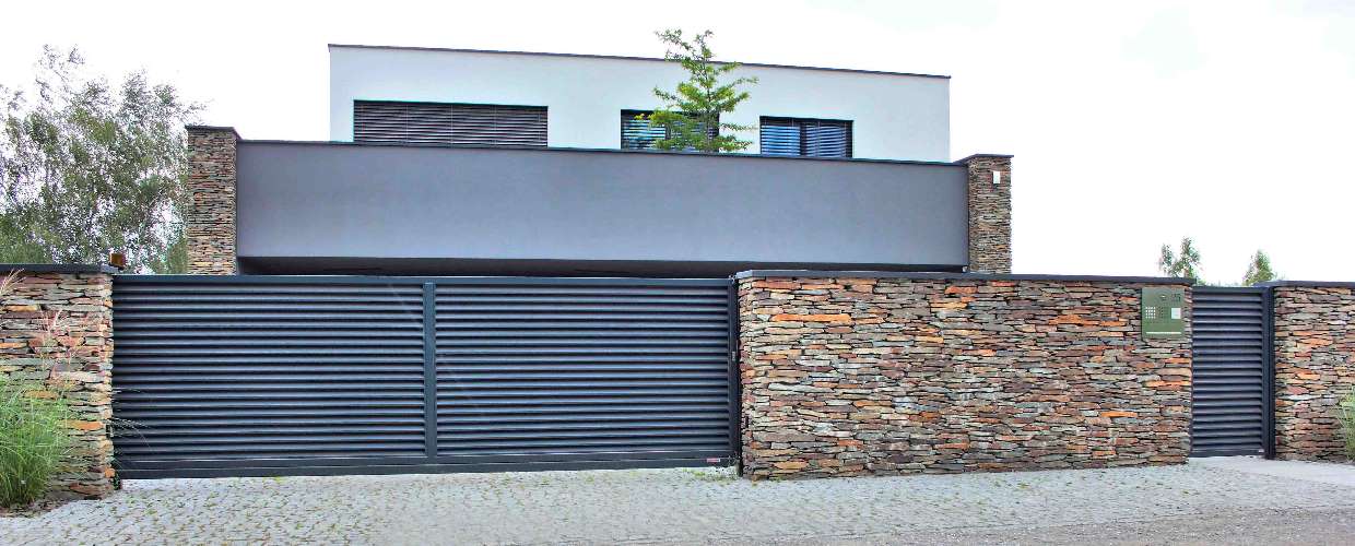 Необходимо, чтобы они подходили к стилевому оформлению участка. Если недалеко находится лес, тогда это беспроигрышный вариант. Секции могут быть заполнены по-разному. Центральная часть — оформлена с помощью наклонных ламелей, а две остальные заполняются простой рейкой. Жалюзи в стиле модерн смотрятся особенно современно. Это рациональное решение оформления загородного ландшафта.