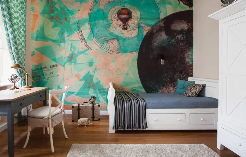 - фотообои могут разнообразить детскую комнату. Стоит быть готовым к тому, что малыш в любую минуту захочет порисовать их, но, с другой стороны, менять их не так уж сложно. Изображение на фотообоях может быть любым и задавать настроение детской: для детей помладше это могут быть сюжеты из сказок, мультяшные герои, приятные природные пейзажи, для школьников подойдут изображения спортсменов, карты из атласа и т.д.;