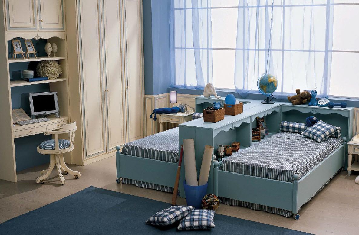 Универсальным стилем в детской выступает средиземноморский. Он оставляет впечатление легкости, дарит ощущение тепла и летнего отдыха – то что нужно для расслабления после дня, проведенного в школе. Сочные синие акценты на теплом фоне, использование природных оттенков и натуральных материалов помогут создать яркую и веселую комнату для двоих детей. Если же добавить декор из веревок, ракушек и состаренного дерева, можно получить необычный интерьер в морском стиле.