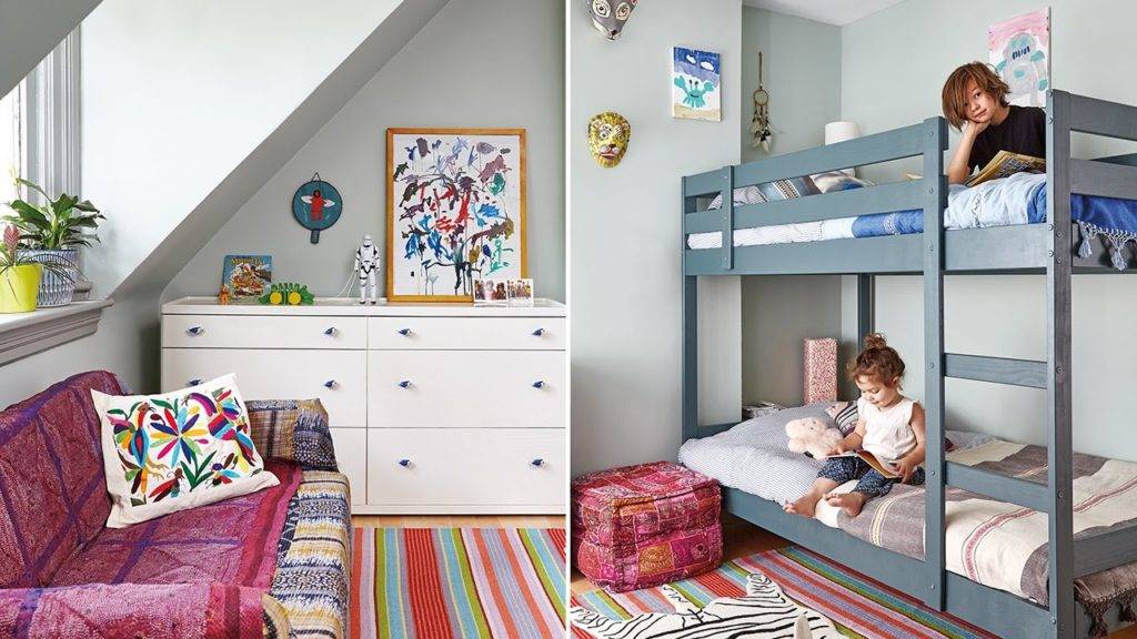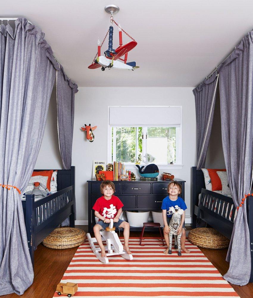 Если вам трудно поместить несколько кроватей в одну маленькую комнату, в качестве альтернативы поставьте одну двухэтажную. Чтобы спальное место каждого яруса было более уединенным, стоит разграничить их с помощью штор.