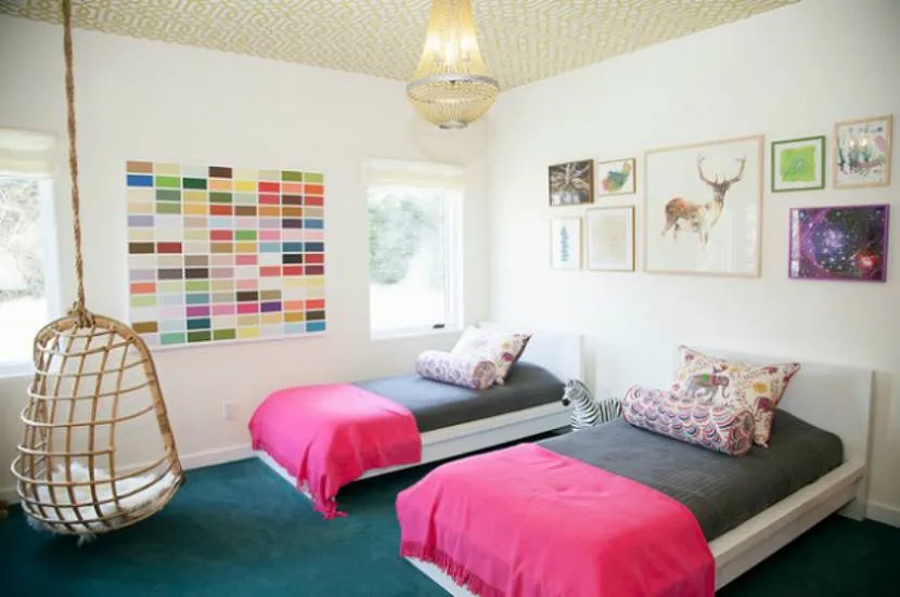 При помощи оригинального декорирования места отдыха удается полностью видоизменить окружающий интерьер. Например, стену над кроватями можно оформить декоративными буквами или другими персональными аксессуарами. Места для сна также застилают разными по цвету покрывалами, размещают возле кроватей непохожие друг на друга коврики или нарядно украшают изголовье девчачьего спального ложа.