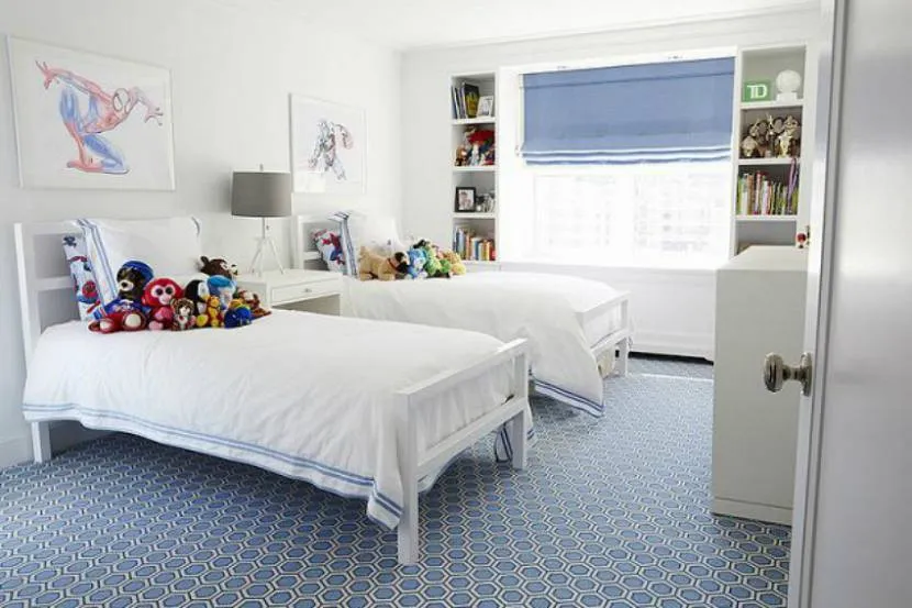 Ковер положите теплый, мягкий, нескользкий, он не должен ездить по полу. Подчеркнуть личное пространство дочери и сына можно, положив небольшие прикроватные коврики близких друг к другу оттенков. Наилучшими характеристиками обладают изделия из шерсти, льна, хлопка, бамбука, шелка: