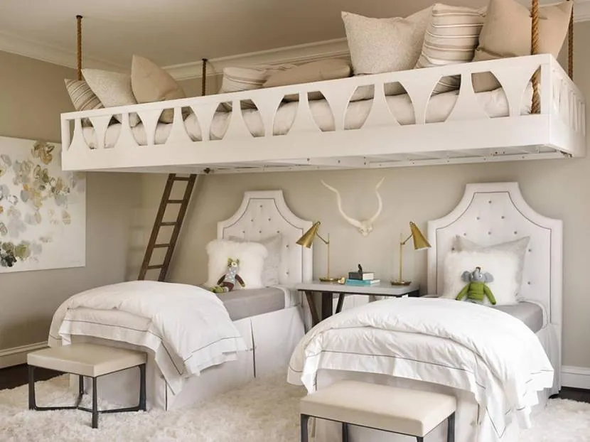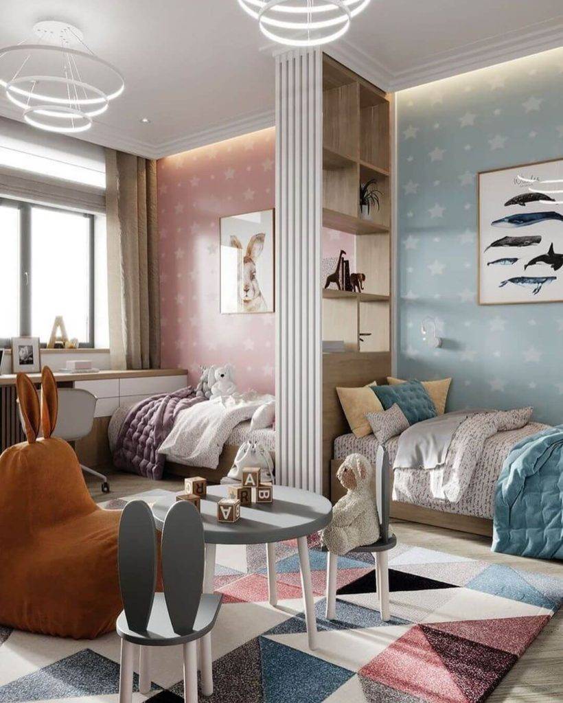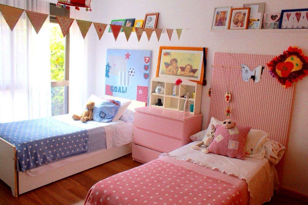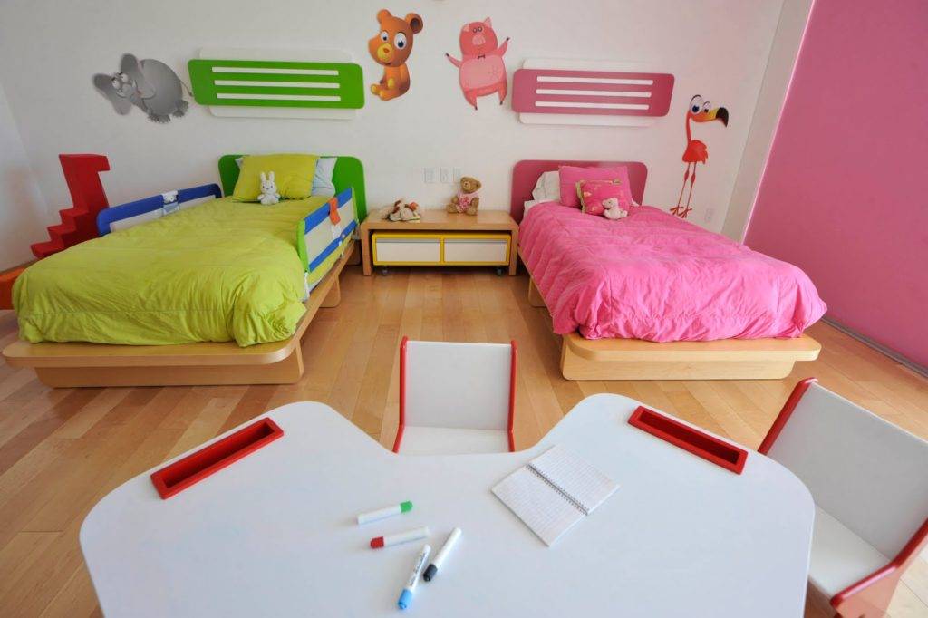 Максимально используйте все доступные уголки детской и не переступайте черту, которую каждый ребенок установил для себя, добавьте две кровати и разместите их с учетом пожеланий маленьких жителей. Для уединения и если место позволяет, размещают кровати в разных углах комнаты. В ином случае поставьте кровати рядом друг с другом, чтобы ваши дети могли поболтать перед сном. Спальные места не обязательно размещать параллельно друг другу, их можно поставить L-образной формой для того, чтобы использовать пространство жилой площади по максимуму.