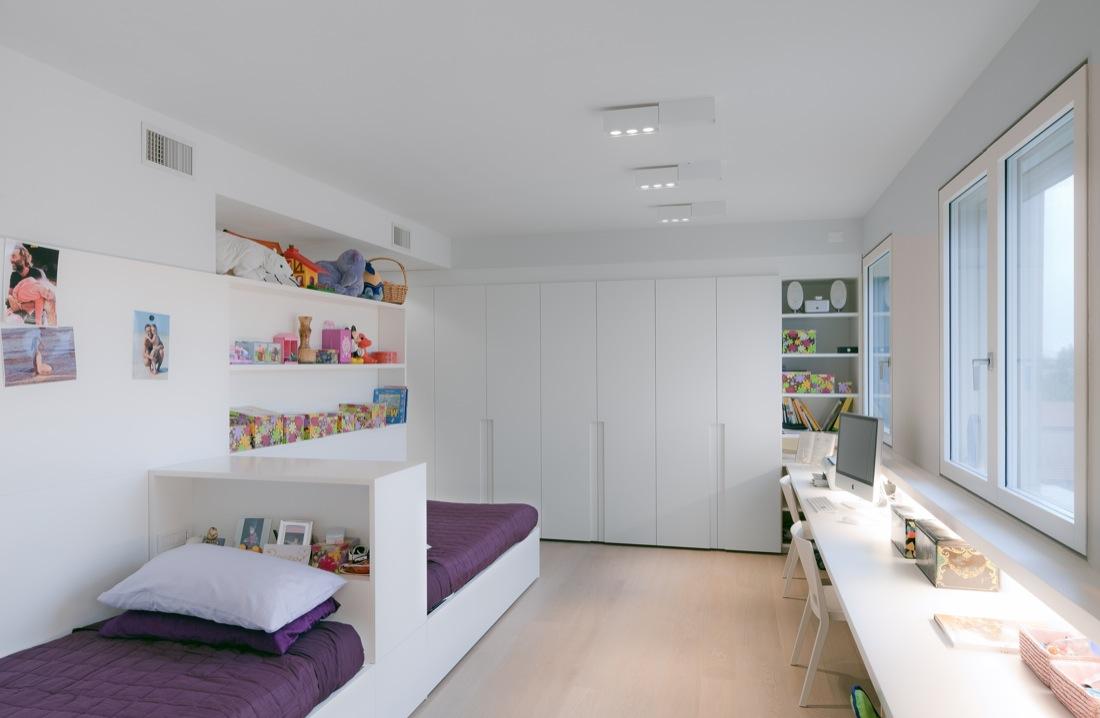 Универсальным и практичным способом отделки детской комнаты для двоих детей выступает белый цвет. К такому фону легко подобрать мебель и декор, а ещё белый визуально расширяет пространство. Если ребенок хочет видеть в интерьере определенный цвет, можно купить покрывало и коврик, исполненные в его любимом оттенке. С возрастом вкусы поменяются и заменить аксессуары не составит труда, а общий вид комнаты не пострадает.