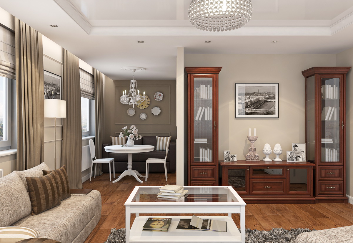 Для выделения области под кабинет, столовую или зону сна стоит начертить чертеж на компьютере или бумаге. Середину помещения желательно оставлять свободной, чтобы было место для занятия спортом или танцами. Чем меньше будет техники, мебели, вещей, тем просторнее и гармоничнее будет смотреться помещение. Если естественного света в зале мало, то заранее продумывают схему искусственного освещения.