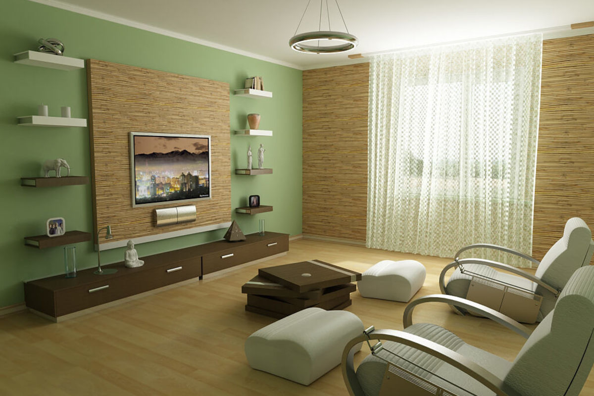 Подойдет для любой комнаты, необходимые предметы расставляются в малом количестве, допустимы элементы декора (домашние растения, деревянные панели).