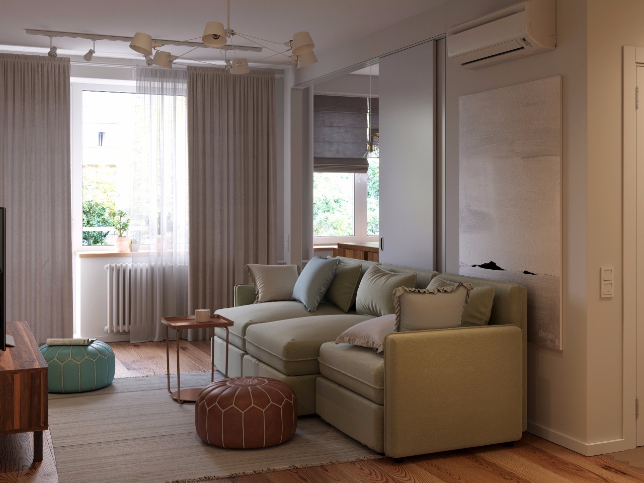 При расстановке мебели в маленькой гостиной 12 кв. м нужно учитывать несколько правил: