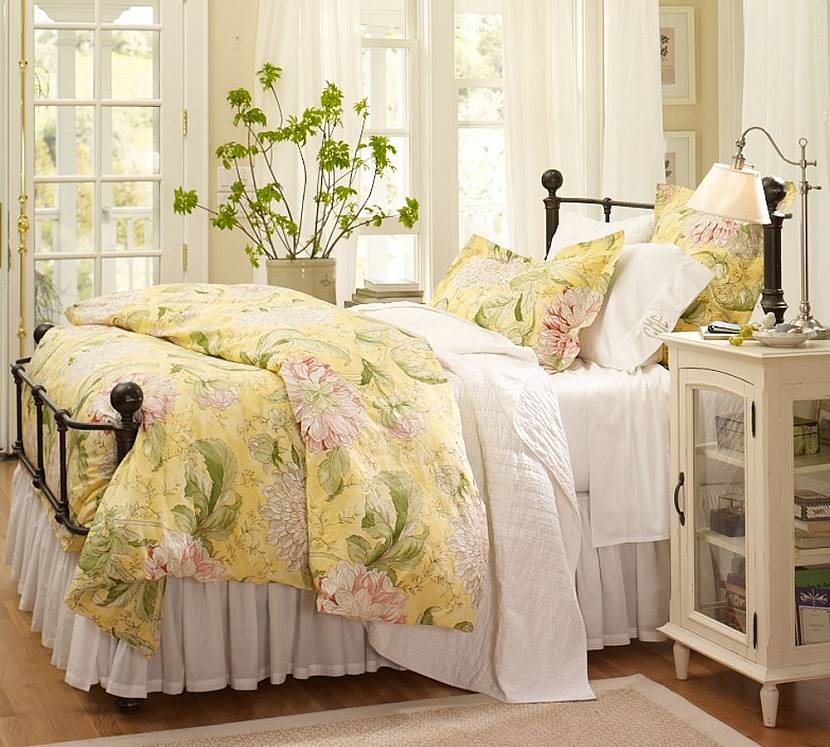 Спальня, как место отдыха, может быть обставлена меньшим количеством предметов. Аутентично для прованса выглядит кровать с кованой спинкой, выкрашенная в белый цвет и застеленная белоснежными простынями. Для разнообразия, текстиль может быть с цветочным узором или кружевными вставками.