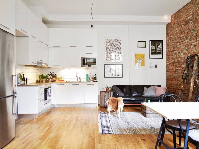 - Делится на функциональные зоны, которые находятся рядом и разделяются мебелью, ширмами, кухонным островом, барной стойкой и другими разделительными элементами.