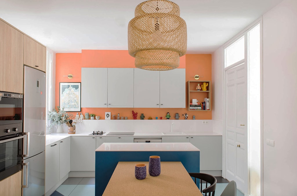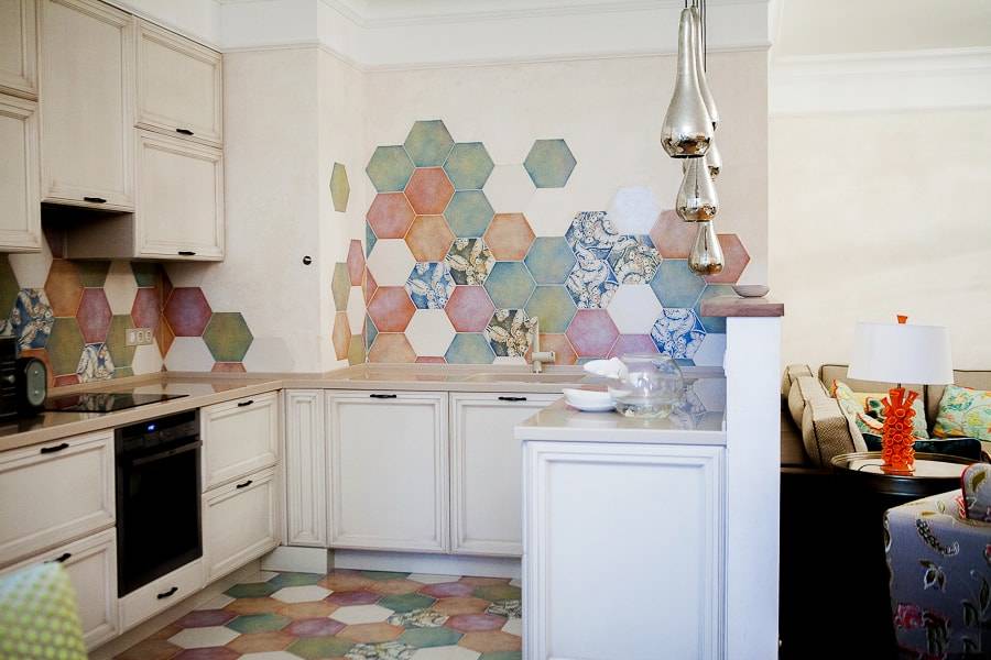 Отделка стен со стороны кухни должна быть максимально практичной. Чаще всего кухонный фартук оформляют с помощью керамической плитки, мозаики или стеклянных панелей с рисунком или без. Яркий фартук может стать изюминкой всего интерьера. Для кухни хорошо подойдут оранжевые, жёлтые и зелёные цвета, эти тёплые и яркие оттенки положительно влияют на аппетит, в то время как синие тона, наоборот, успокаивают.