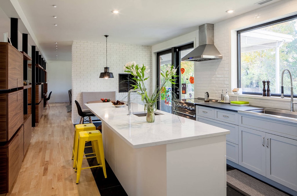 Все, что вам нужно на кухне (тарелки, раковина, шкафы, столешница), может поместиться на большом многофункциональном острове. Это привлекательное решение, подходящее для квартир и небольших домов. Оно лучше подходит для современной жизни, чем серия шкафов и столешниц с одной стеной в открытой комнате. Кроме того, остров может визуально расширить площадь. Кухня незаметно превращается в столовую, обеспечивая жителям и гостям плавный переход от приготовления салатов и резки жаркого до поедания аппетитных блюд.