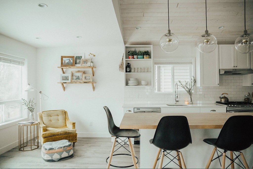 Барная стойка и подвесные светильники в качестве разделителей пространства