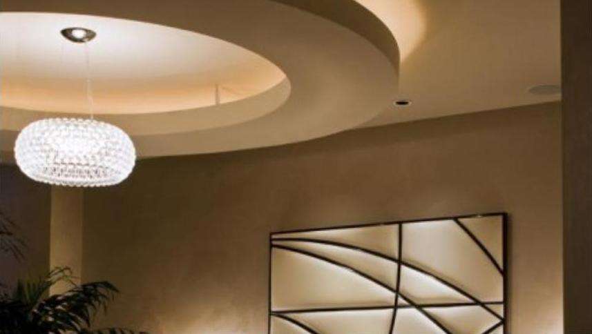 Потолок из гипсокартона прекрасно справляется с зонированием кухни-гостиной