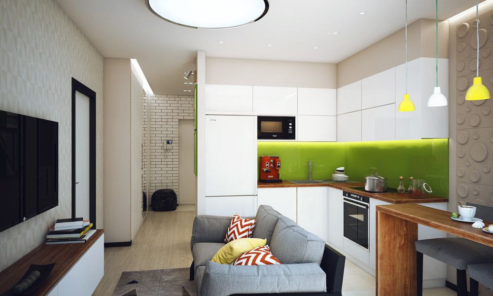 Кухонный гарнитур является не просто функциональной зоной приготовления еды, а частью интерьера. Замаскированная под шкаф или спрятанная за перегородкой кухня визуально освобождает больше места для гостиной.