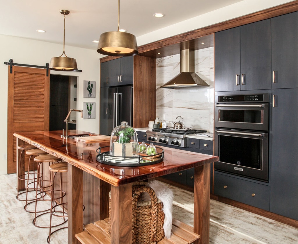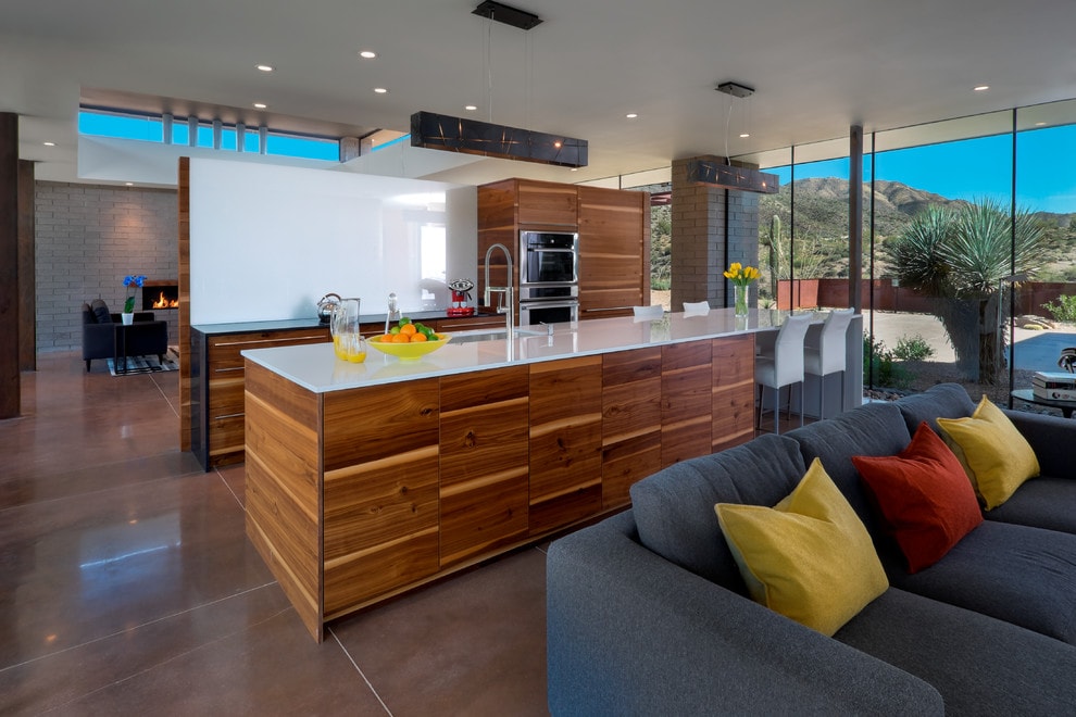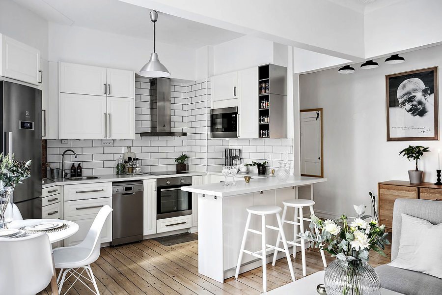 Присмотритесь внимательно к этому варианту, если у вас уже есть какая-либо граница (реальная или визуальная) между кухней и гостиной – барная стойка, перегородка, фальш-стена.